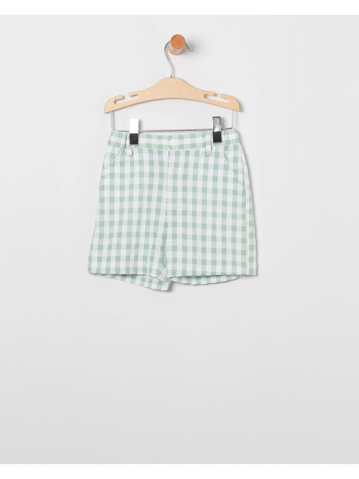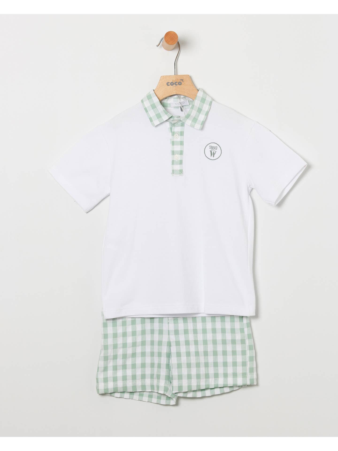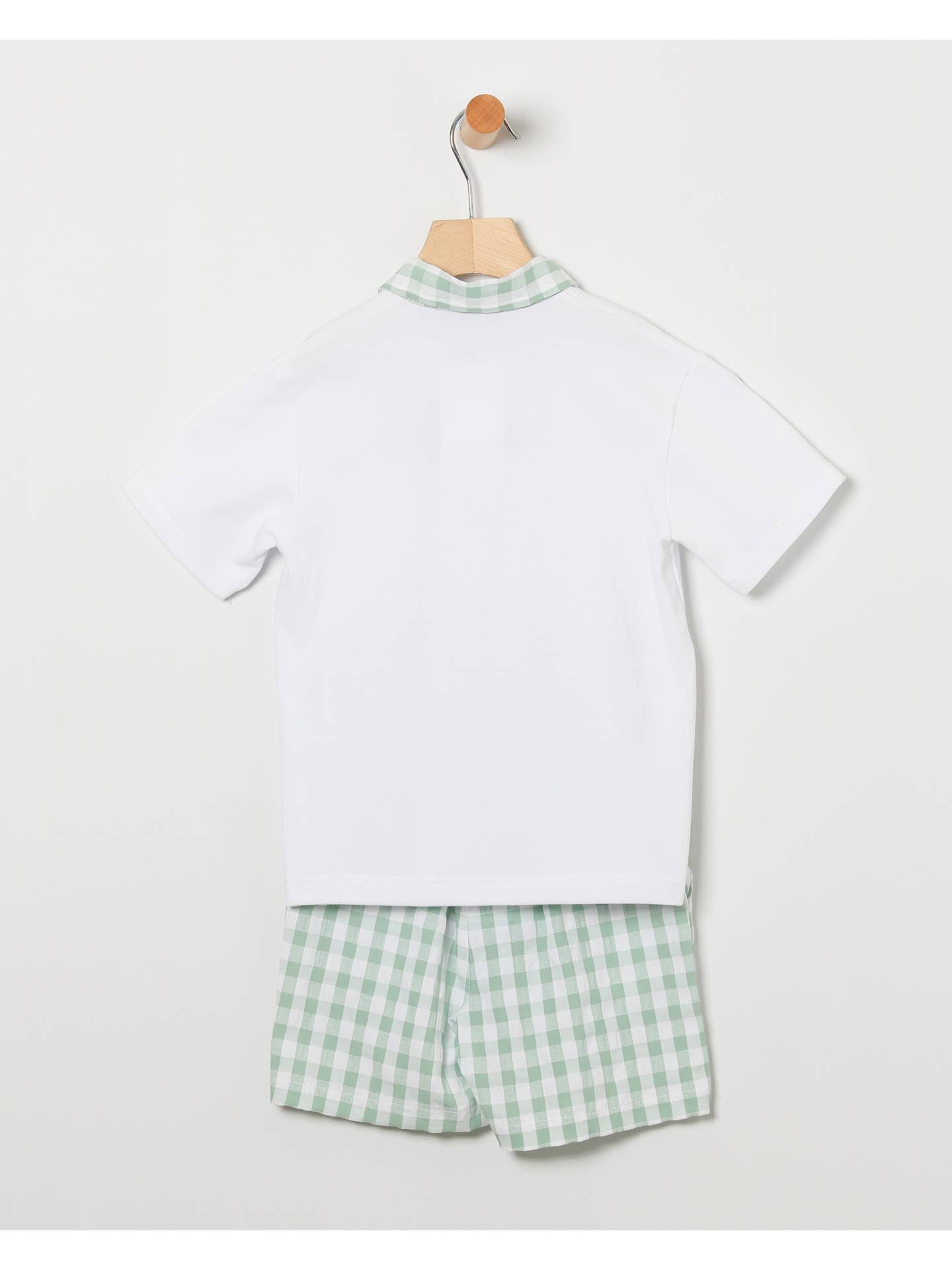White Embroidered Polo Set for Boys with Green Gingham Collar Trim and Placket and Light Blue Gingham Bermuda Shorts