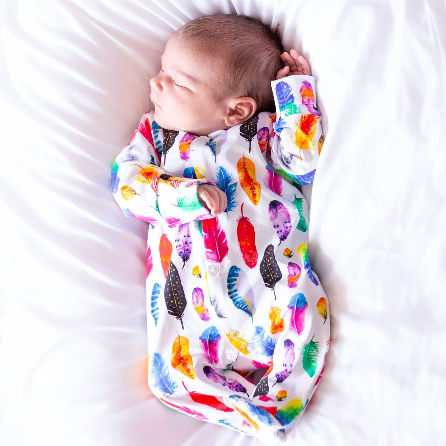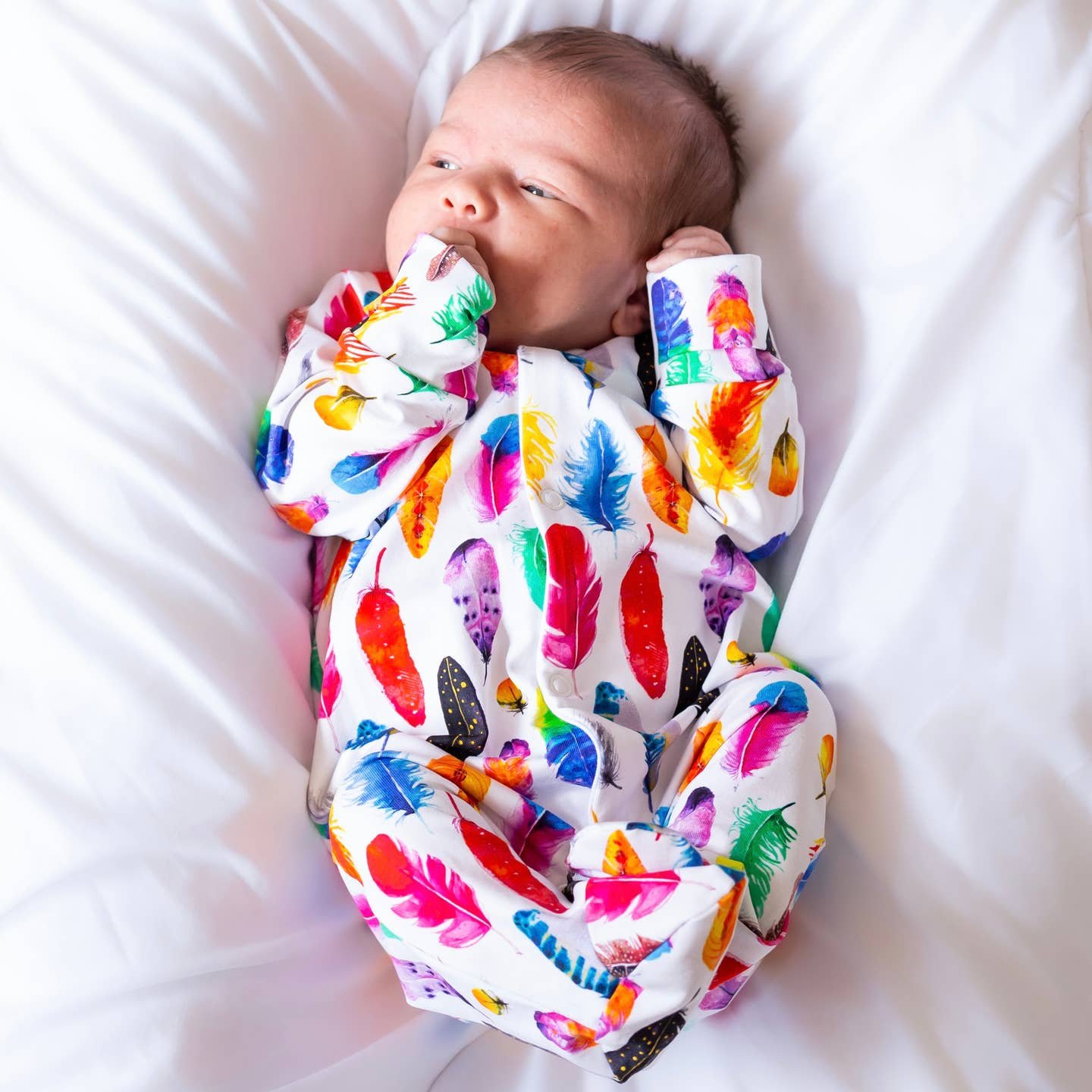 Our new and gorgeous Feather print sleep suit is the perfect one-piece for any baby.