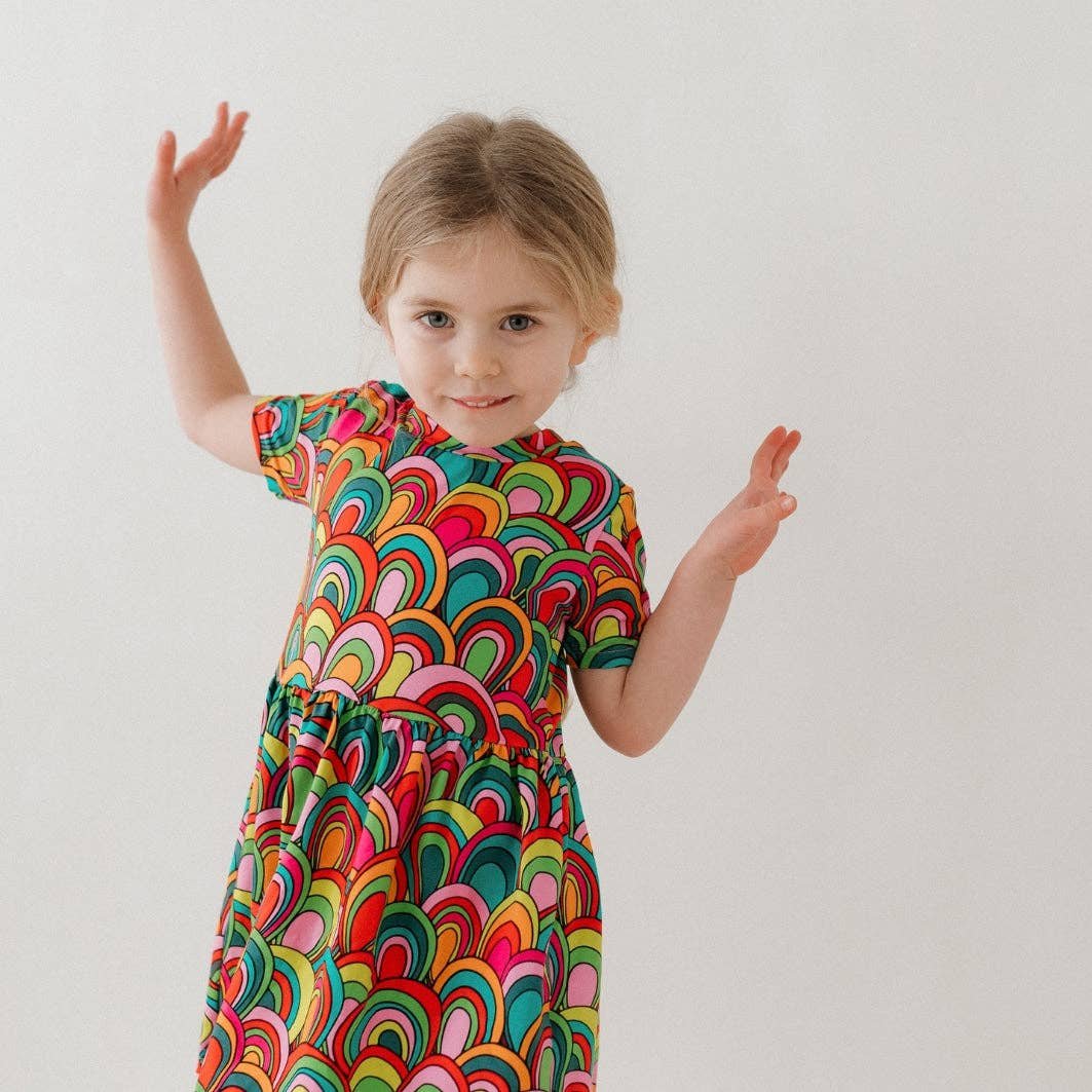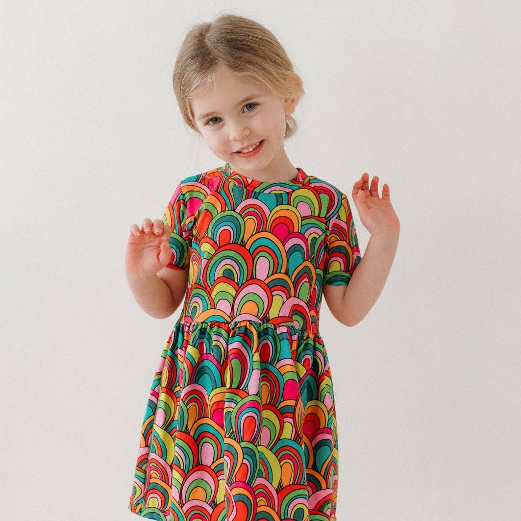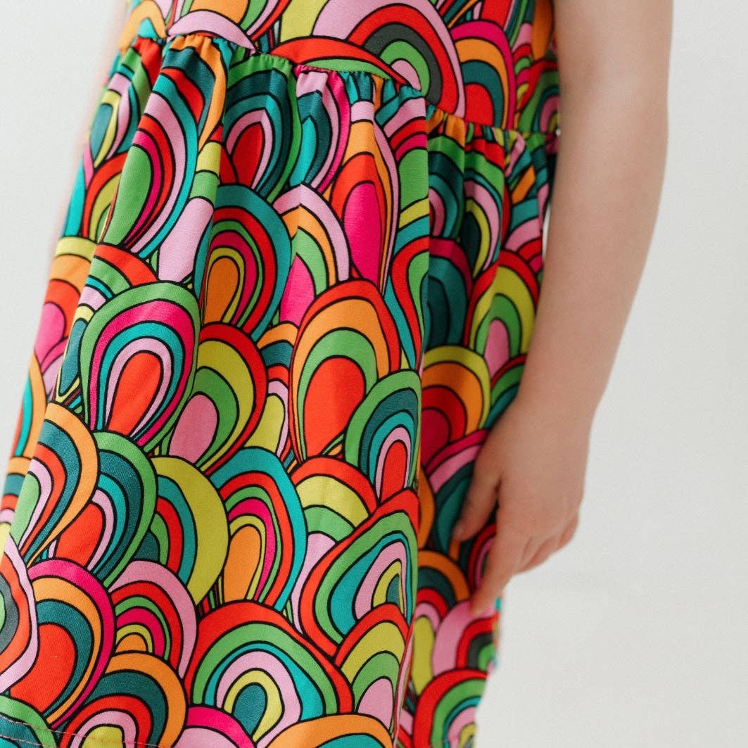 Our new Rainbow Dress is made in the UK from 95% Cotton 5 % Elastane Jersey.