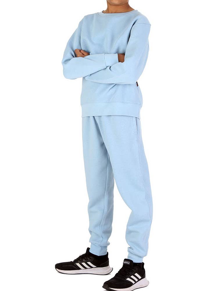 The Trendy Toggs denim original kids tracksuit. This sweatshirt top and tracksuit bottoms are made from a blend of soft fleece, making the tracksuit comfortable to be worn all day. It has a crew neck sweatshirt with long sleeves, elasticated cuffs and the joggers come with side pockets and an adjustable waistband. Cotton 80%, Polyester 20%