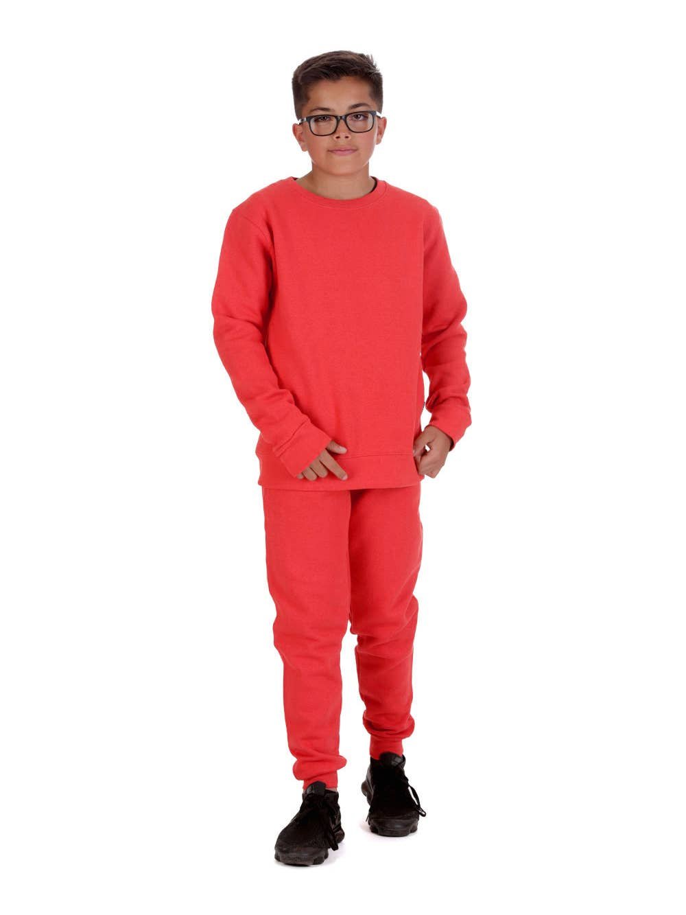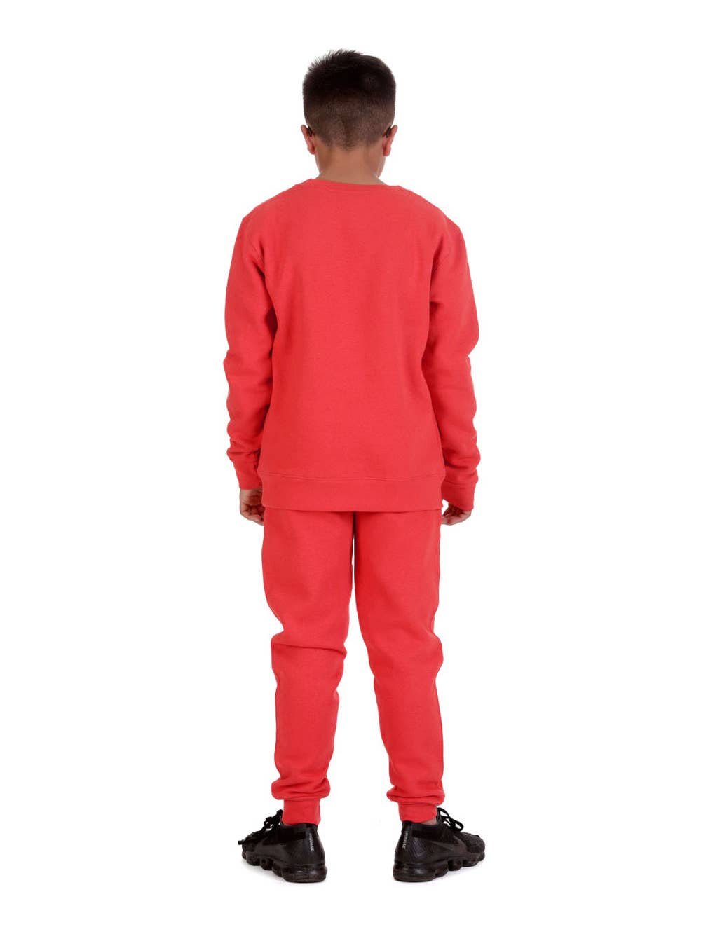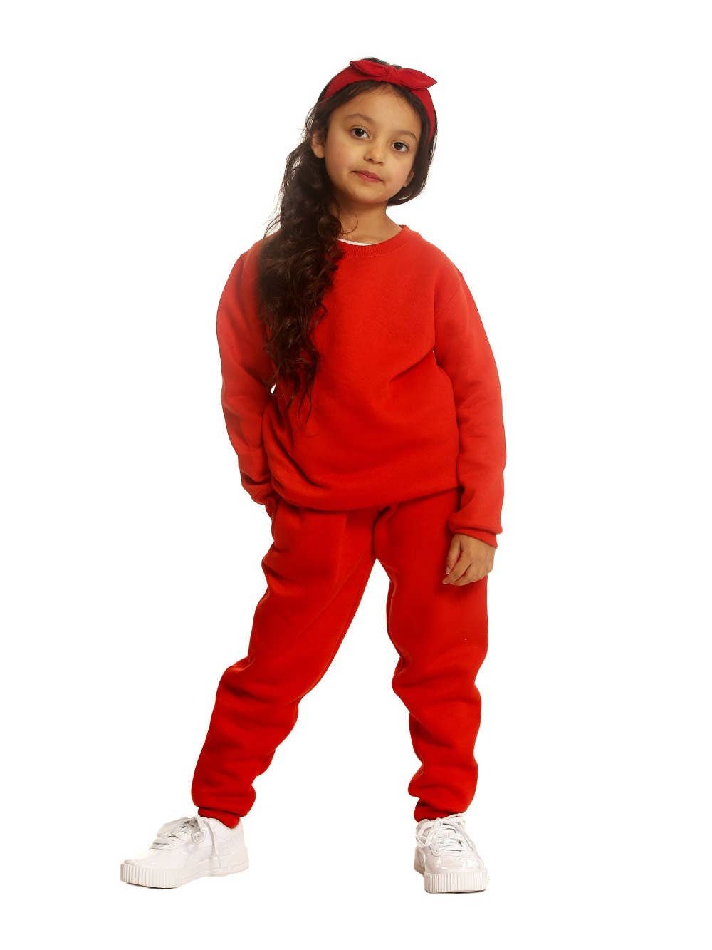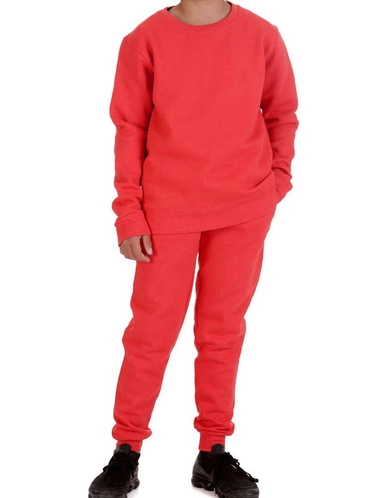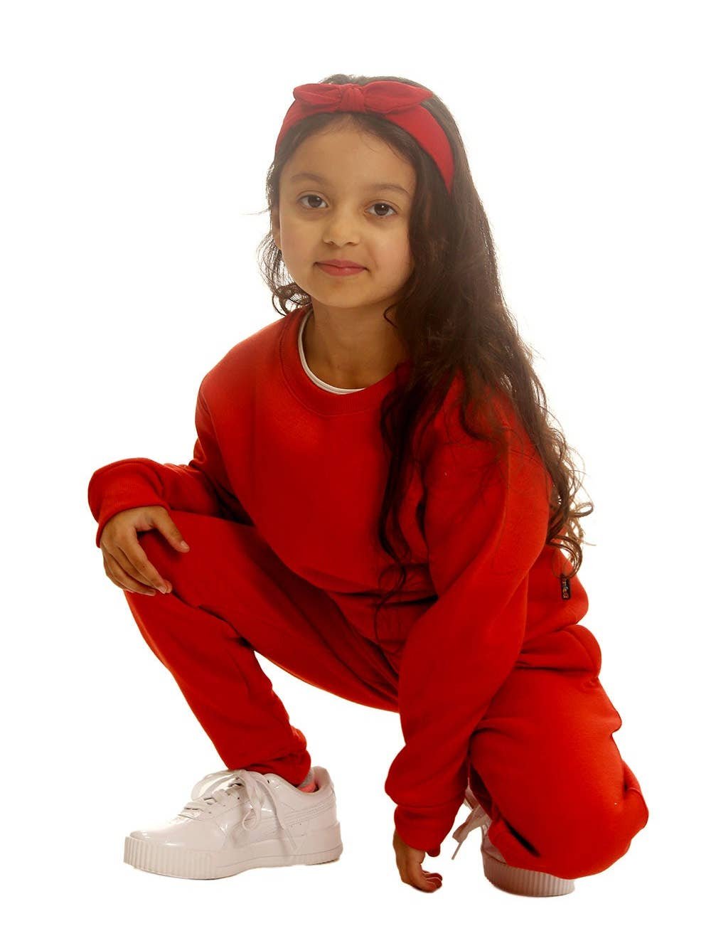 The Trendy Toggs red original kids tracksuit. This sweatshirt top and tracksuit bottoms is made from a blend of soft fleece, making the tracksuit comfortable to be worn in all day. It has an crew neck sweatshirt with long sleeves, with elasticated cuffs and the joggers come with side pockets, and a adjustable waistband. Model is age 5 and wears a 5-6 years. Cotton 80%, Polyester 20%.